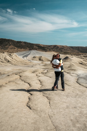 Young couple wearing sportswear and hugging outdoors, picture taken in the mud volcanoes park in Romania