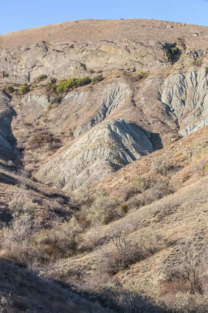 A semi-desert covered with fresh green grass in spring. Clay ravines with traces of soil erosion and weathering at the foot of Cape Meganom. Crimea, a sunny day in April.