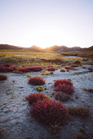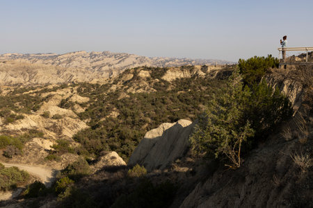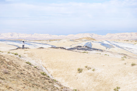 Colorful Mud volcanoes panoramic view with female person standing n Chacuna managed reseve in Georgia. Mysterious and unique places in caucasus.