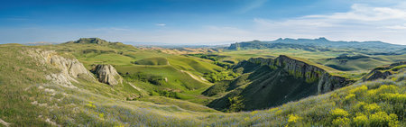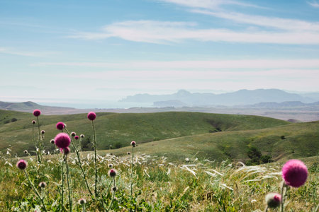 A panorama of beautiful green hills. A summer landscape in the Crimea. Grasses and thistles. Front view.