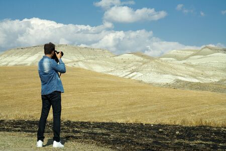 Young man photographer taking photo for beautiful landscape on mountain peak