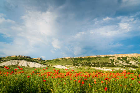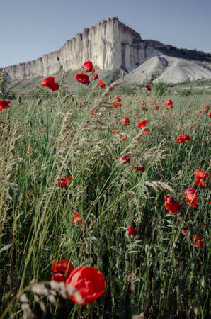 Poppy field against the background of rocky mountains, panoramic view. Belaya Skala, Belogorsk, Crimea