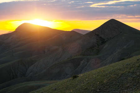 Summer landscape in the Crimea, the panorama of the sunset among the hills and mountains. Front view.