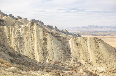 Fancy clay figures formed as a result of soil erosion and weathered on the slope of Cape Meganom. Crimea, cloud, day in October.