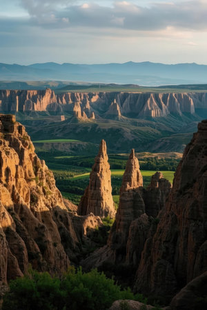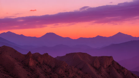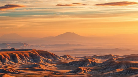Golden Hour Over Rugged Landscape with Distant Hills