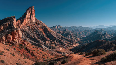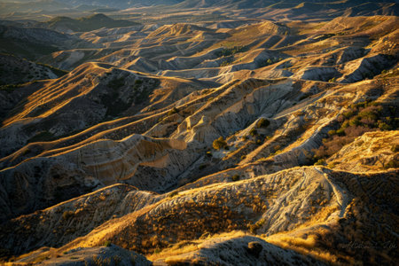 Early morning sunlight accentuates the intricate textures and contours of eroded mountain ridges in a breathtaking landscape.