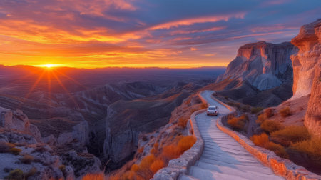 Car driving on a mountain road at sunset