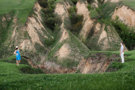 young couple a guy and a girl are walking in the green mountain hills