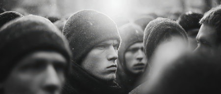 Men in dark clothing and knit hats gather closely in a cold environment expressing solemnity and unity during a significant occasion.