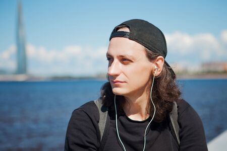 A young white guy or man in casual wear is enjoying the beauty of nature while being out of town, life style.
