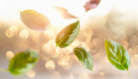 flying fresh natural basil leaves on white backdrop, fresh herb