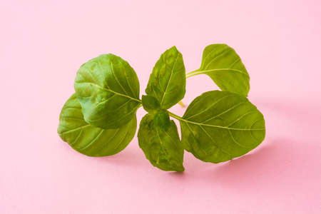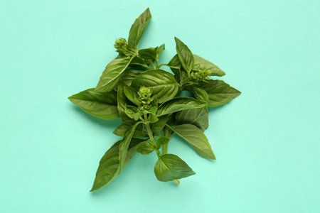 Fresh sprig of basil and its leaves on a green background. Top view, flat lay