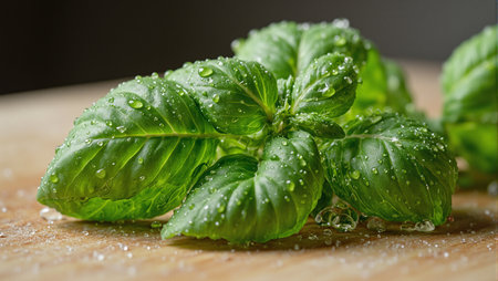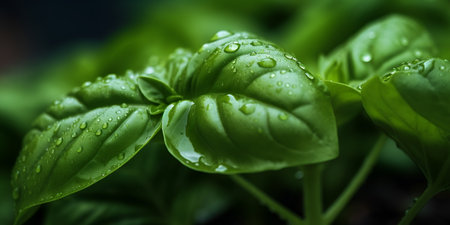 Fresh Green Basil Leaves with Water Droplets, Close-Up
