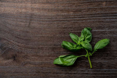 Fresh basil plant on a dark background. Top view. Flat lay. Healthy food composition. Harvest concept