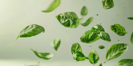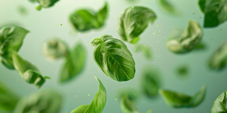 Freeze Motion Shot of Flying Fresh Basil leaves. Top shot.