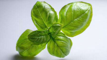A visually appealing arrangement of fresh basil leaves on a clean white background, perfect for culinary themes, natural art inspirations, and healthy cooking ideas.
