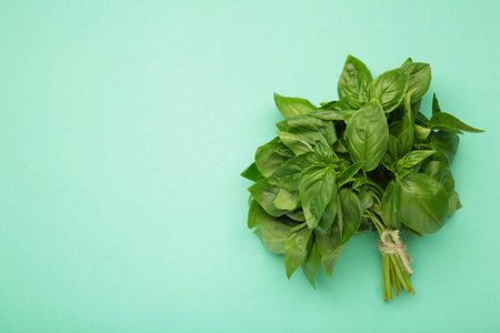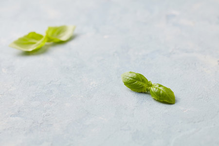 Fresh green basil leaves on a light blue concrete background. Copy space.