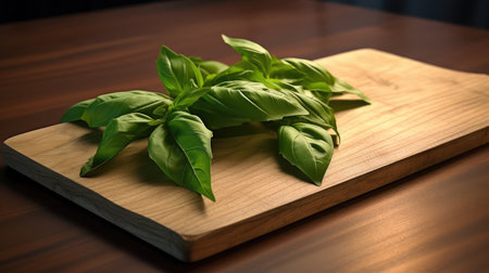 freshly picked basil leaves on wooden cutting board, concept of simple natural healthy ingredients