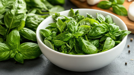 A Fresh basil leaves in white bowl, vibrant green and aromatic