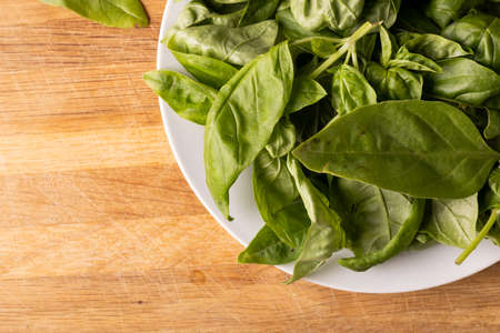 Directly above shot of fresh baby spinach in place on cutting board. unaltered, healthy food, leaf vegetable, raw food and organic concept.