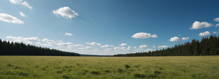 A stunning panoramic view of a lush green field under a bright blue sky with fluffy white clouds. This landscape embodies tranquility and natural beauty, perfect for relaxation and exploration.