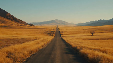 A stunning view of an open road stretching through golden plains under a blue sky. Serene mountains rise in the background, creating a peaceful and inviting landscape.