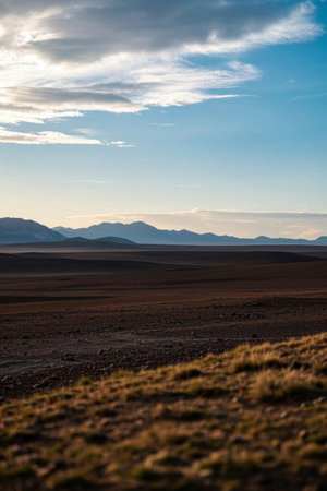 Experience the beauty of a vast desert landscape at dusk, where expansive horizons meet tranquil mountains under a stunning gradient sky in earthy hues.
