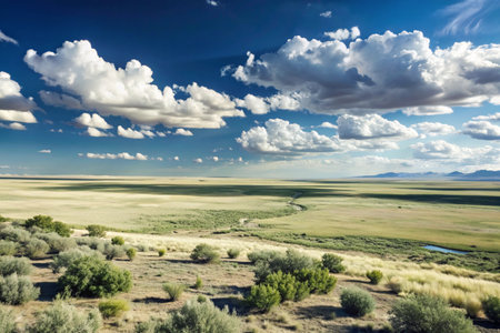 the desert landscape stretches vast and serene, evoking the eerie solitude of andrew wyeth's masterpieces, as the midwest grassland undulates in gentle waves, its tall blades swaying rhythmically in the wind, beneath an enormous blue sky that seems to swallow the horizon, exuding a sense of freedom and endless possibility. ai generated