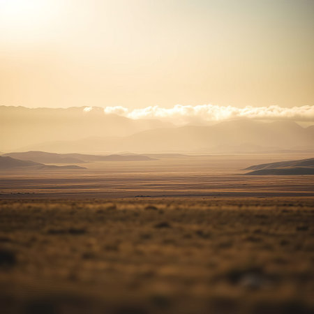 Golden Hour Serenity Tranquil Desert Landscape Bathed in Warm Sunlight and Bokeh Effect
