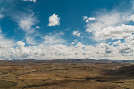 Vast steppe grassland with endless horizon under a clear blue sky and scattered clouds