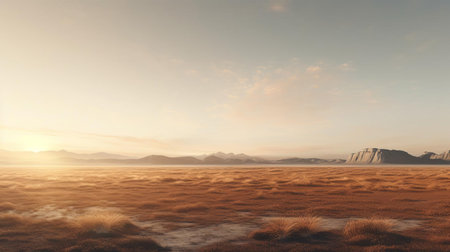 the barren landscape stretches out before us, featuring a lush grassy field that contrasts beautifully with the earthy tones of the surrounding terrain, showcasing hyper-realistic details that transport us to a serene atmosphere, all captured during the warm golden hour with the vast horizon stretching out in the background. ai generated