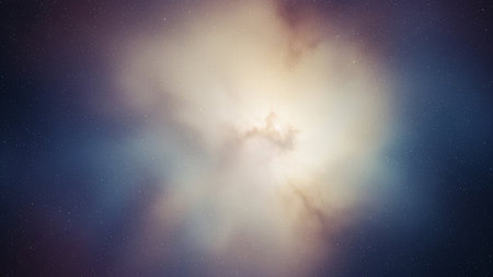 A softly glowing nebula with a bright center and distant stars, rendered in subtle cosmic hues of yellow, blue, and purple.