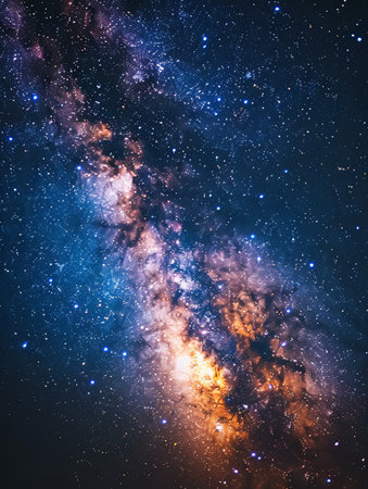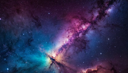 A breathtaking view of the Milky Way galaxy showcases vibrant colors and intricate patterns of stars and cosmic dust against a dark night sky, revealing the beauty of the universe