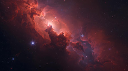 Vibrant Cosmic Cloudscape A Fiery Nebula with Brilliant Stars, Soft Pinks, and Deep Purples