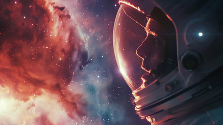 A lone astronaut gazes out of their helmet visor at a breathtaking nebula, their expression a mix of wonder and isolation. (cinematic, wide shot)