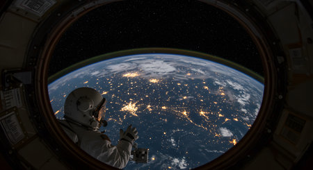 An astronaut views the earth's glowing city lights from a spaceship window creating a sense of wonder Use for space exploration concepts.