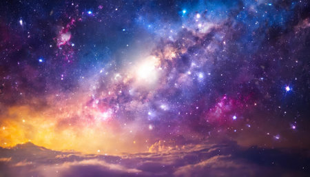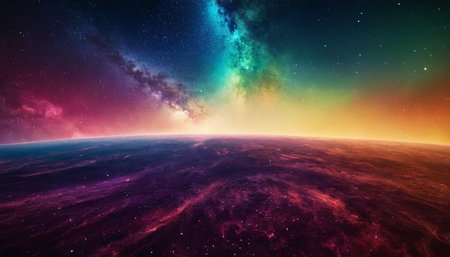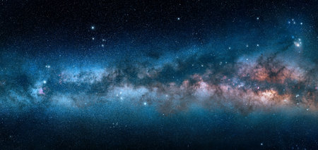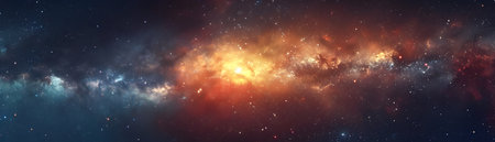 A panoramic view of the Milky Way galaxy, showcasing vibrant colors, sparkling stars, and swirling cosmic dust.
