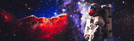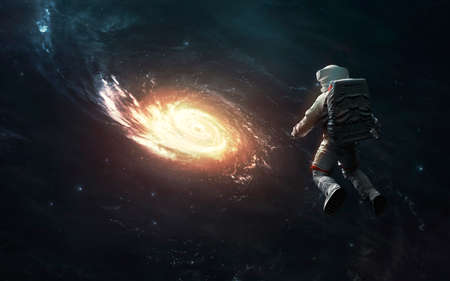 Astronaut cosmonaut discovery of new worlds of galaxies panorama, fantasy portal to far universe.