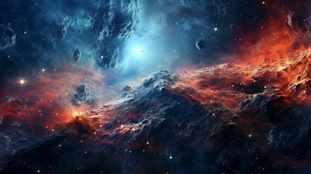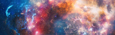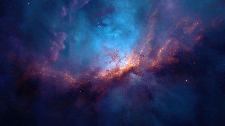 Infinite beautiful cosmos dark blue and orange background with nebula, cluster of stars in outer space. Beauty of endless Universe filled stars.Cosmic art, science fiction wallpaper