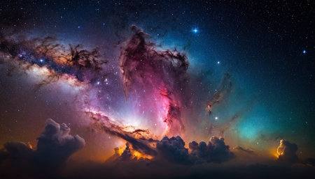 Bright stars and colorful gas clouds fill the night sky showing the beauty of the universe above a dark landscape during late evening. The scene displays deep space elements vividly.