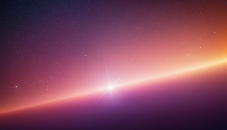 Colors showing bright starburst illuminating a cosmic horizon with gradient colors of purple orange and pink.