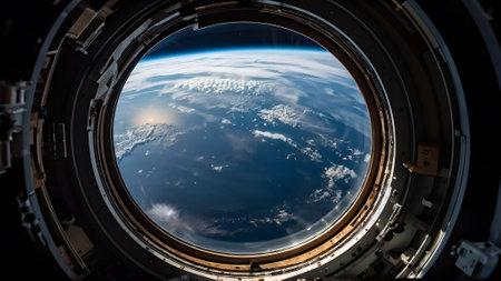 A cosmic view of the planet Earth and the vast expanses of the Universe from the porthole window of the ISS space station.