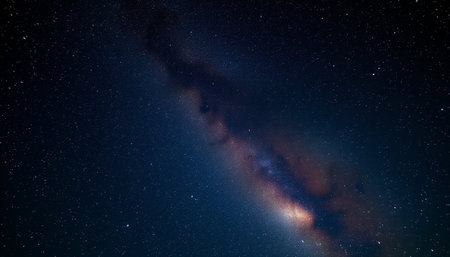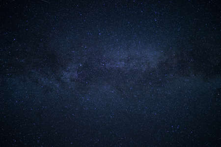 The Milky Way astrophotography: horizontal panoramic view of the galaxy and dark blue night sky, shot with star tracker
