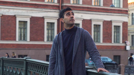 Handsome male tourist enjoing architecture. Media. Side view of carefree young man standing and thinking about something in the street on the background of driving cars.