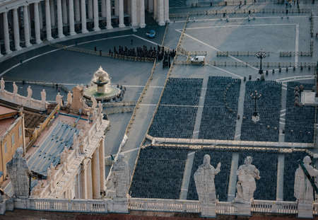 Saint Peter's Square is a large plaza located directly in front of St. Peter's Basilica in Vatican City. Chairs are prepared for mass and general audience programs