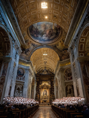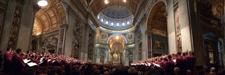 A choir fills the Sistine Chapel with music, illuminated by the beautiful upper light, creating an atmosphere of reverence and spiritual connection.