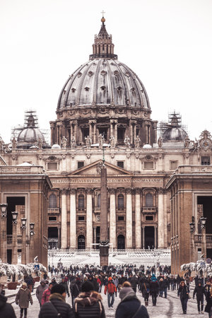 St. Peter's Basilica on a snowy day in Vatican City, Rome, Italy