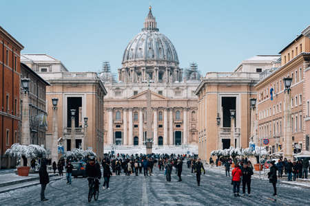 Rome, Italy. February 26, 2018: Vatican City with snow, crowd of people in Via della Conciliazione. Dome of St. Peter.