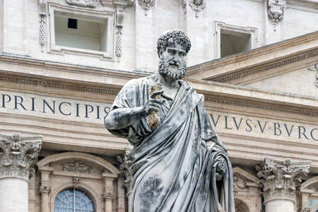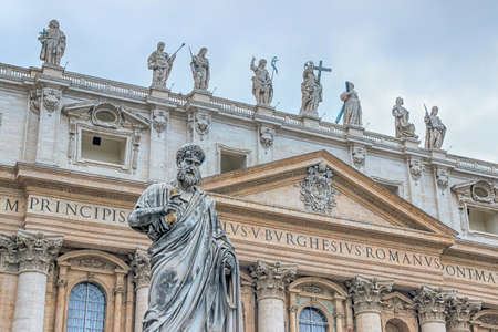 Statue of apostle Peter in front of facade of Saint Peter's Basilica in Vatican, Italia.