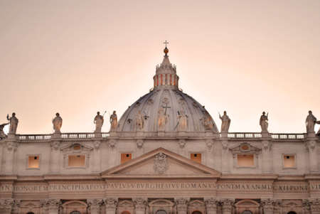 Facade and dome of The Papal Basilica of Saint Peter in the Vatican (Basilica di San Pietro), a Renaissance style church in Vatican City, within the city of Rome, Italy